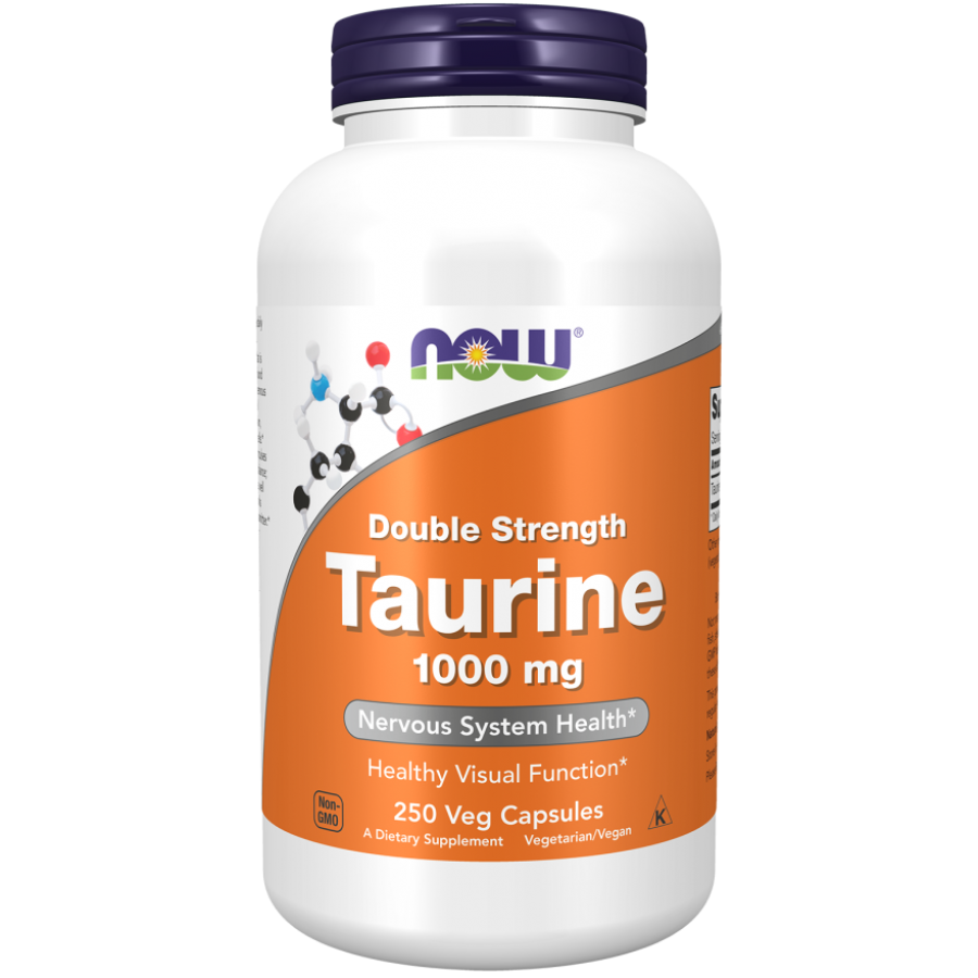 Таурин — условно незаменимая аминокислота, которая не используется для синтеза белка, однако главным образом обнаруживается в свободной форме в большинстве тканей, особенно в нервной системе. Этот элемент стабилизирует клеточные мембраны тканей, облегчая процесс перемещения калия, натрия, кальция и магния в клетках и за их пределами. Таурин способствует генерации и регуляции нервных импульсов, а также обеспечивает поддержку нормального водного баланса. Кроме того, эта аминокислота используется в зрительных путях, а также в мозговой и нервной системах, где совместно с глицином и ГАМК выступает в роли нейромедиатора. Данный продукт содержит в 2 раза больше таурина (1000 мг), чем продукт обычного действия (500 мг), созданный компанией NOW Foods.